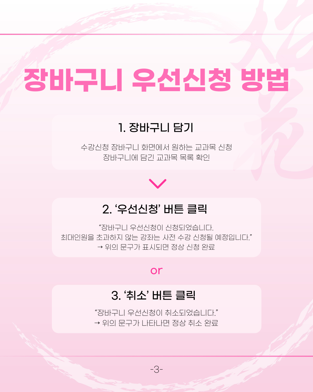 이번 학기 수강신청부터는 ‘장바구니 우선신청 제도’ 가 새롭게 도입되어 보다 체계적인 수강신청이 진행될 예정입니다.