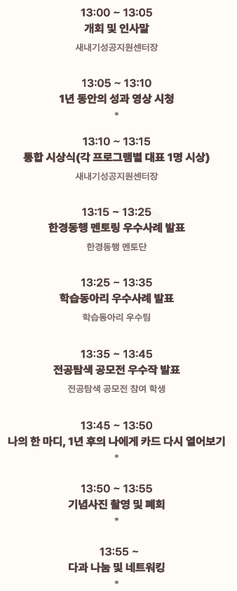 - 한경동행멘토링·학습동아리·전공탐색 공모전 등 비교과 프로그램 우수작 소개, 시상
