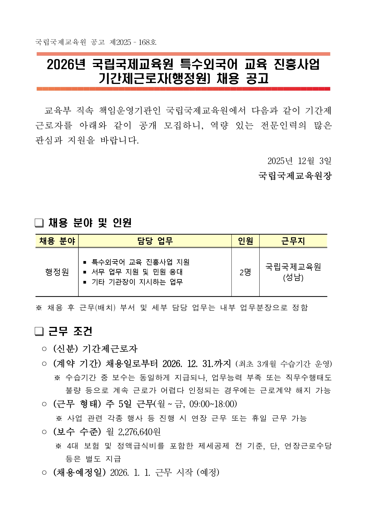 [취업] [국립국제교육원] 2026년 특수외국어 교육 진흥사업 기간제근로자(행정원) 채용 공고