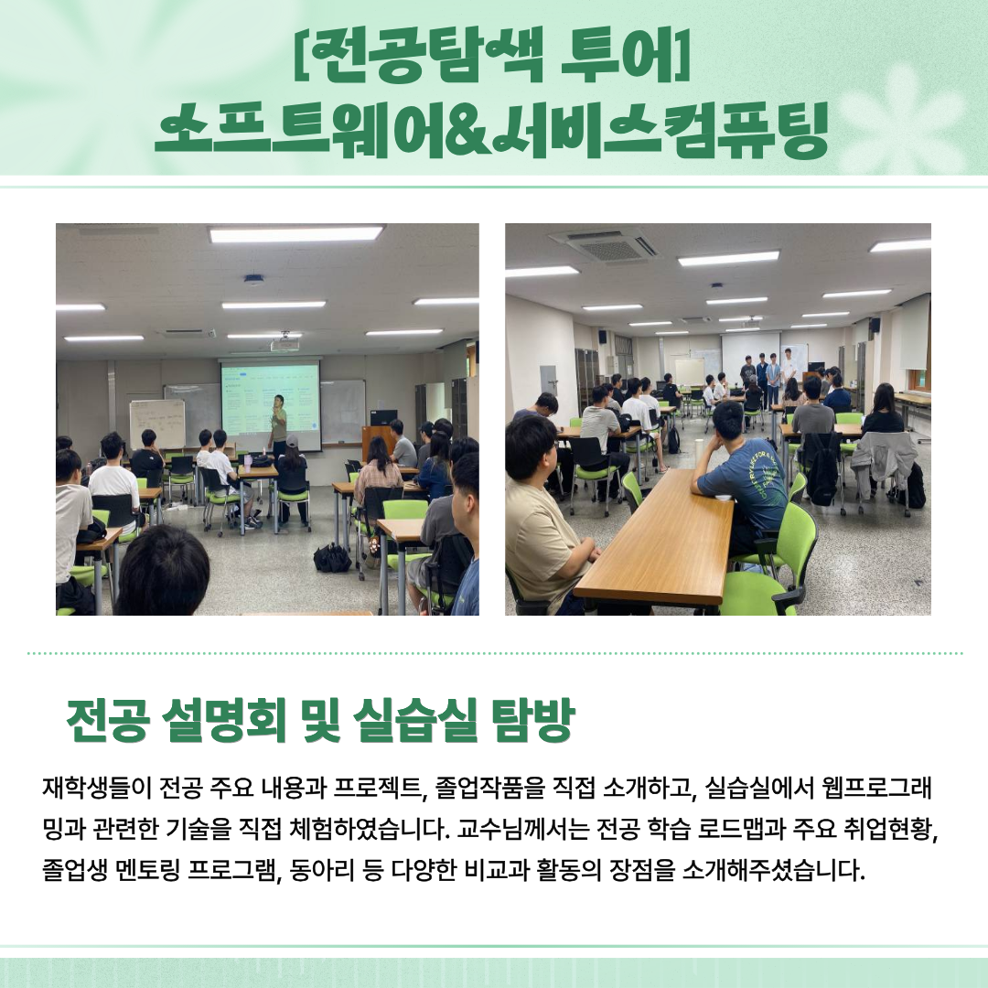 실무와 현장을 직접 체험할 수 있는 교수님 강연 및 실습실 탐방, 재학생 간담회 등 다양한 활동을 소개합니다.😊