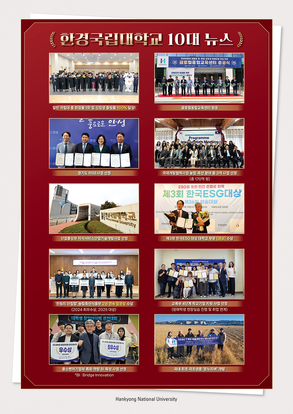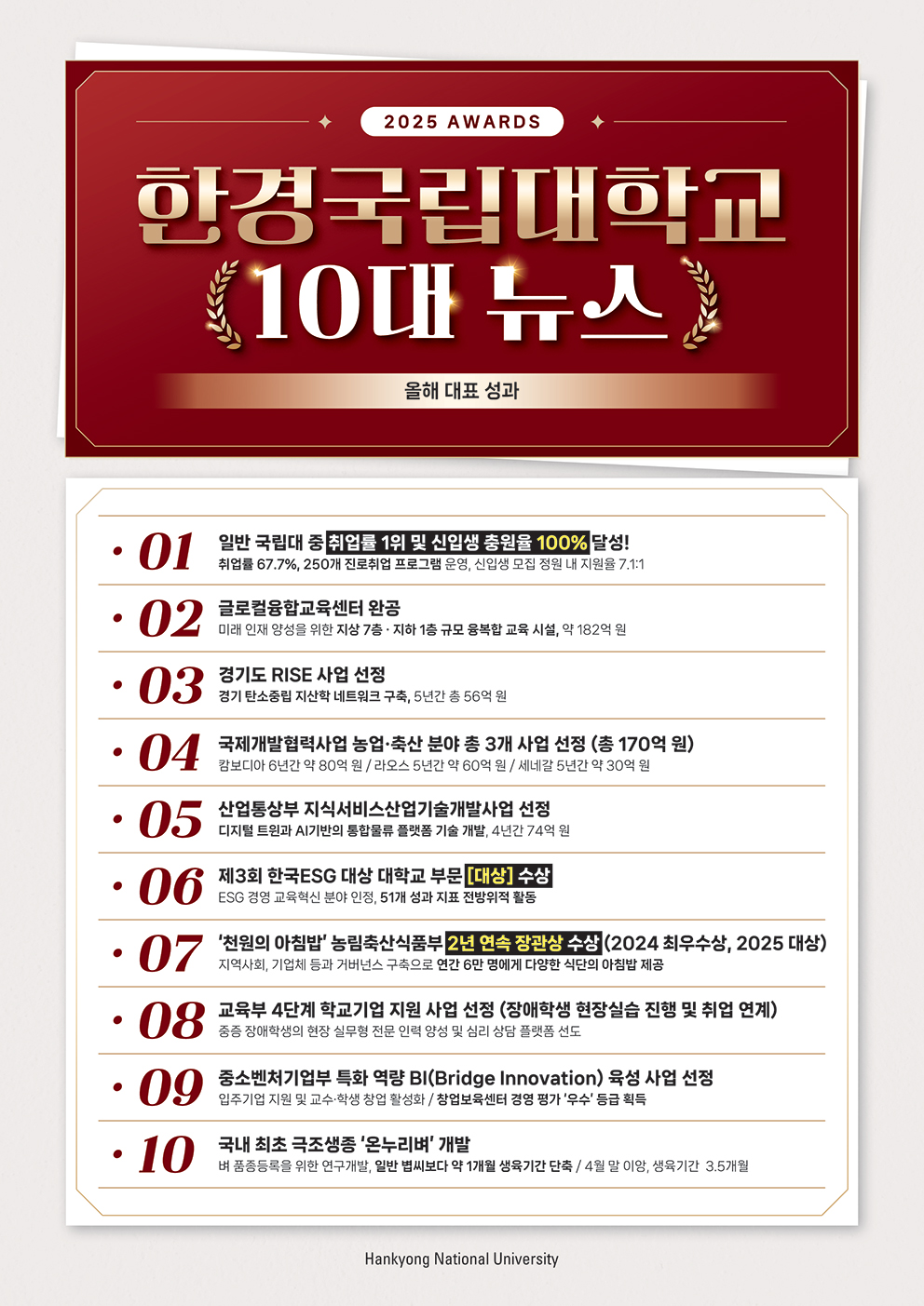 fnctId=bbs,fnctNo=81 페이지 공유 글번호 92205 2025년도 한경국립대학교 10대 뉴스 작성일 2026.01.27 수정일 2026.01.27 작성자 홍보실 조회수 613 2025년도 우리 대학 대표 성과에 따른 10대 뉴스입니다. 첨부파일 첨부파일이(가) 없습니다.